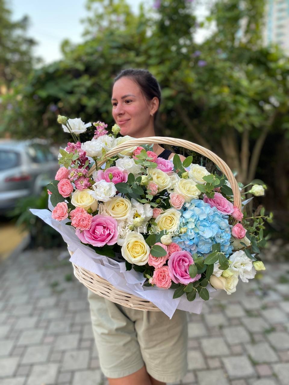 розы, эустома, гортензия, бомбастик, маттиола ( или аналог), эвкалипт, корзина.