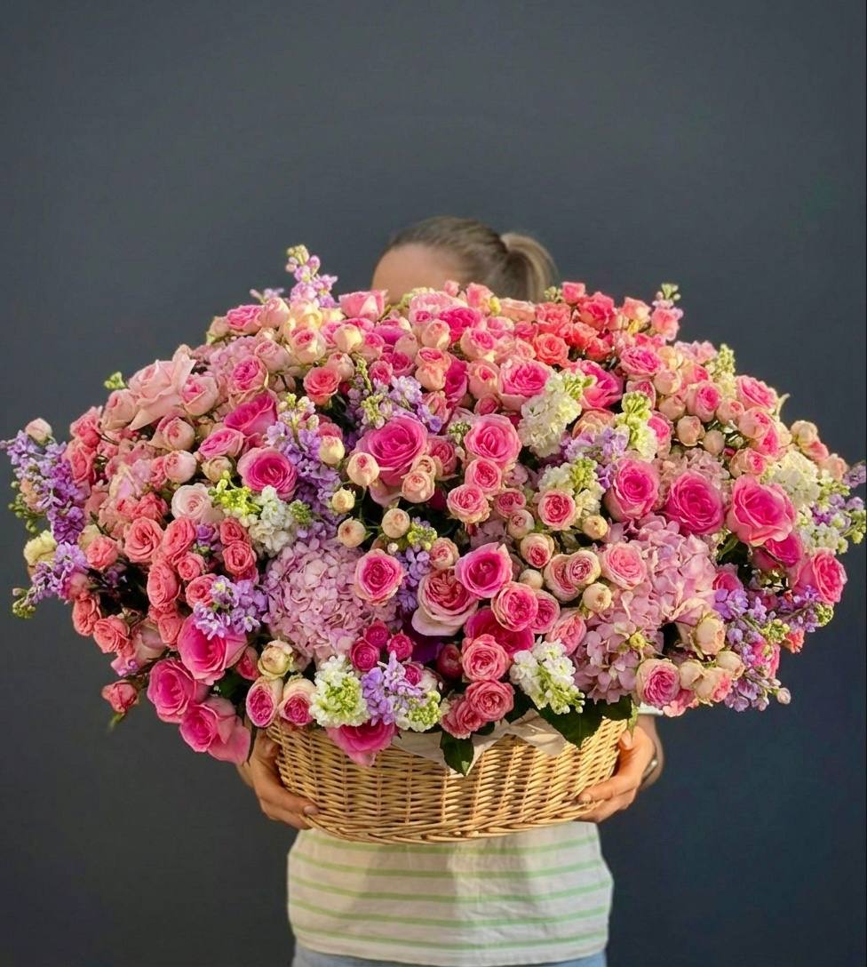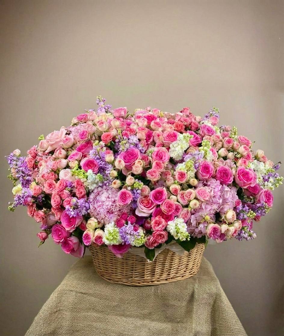 Пышная корзина с розами и гортензией раскрывается мягкими переходами розовых тонов. Эустома и диантус добавляют воздушности, а эвкалипт создает свежую основу для многослойной композиции. Авторская работа для важных событий и значимых встреч.