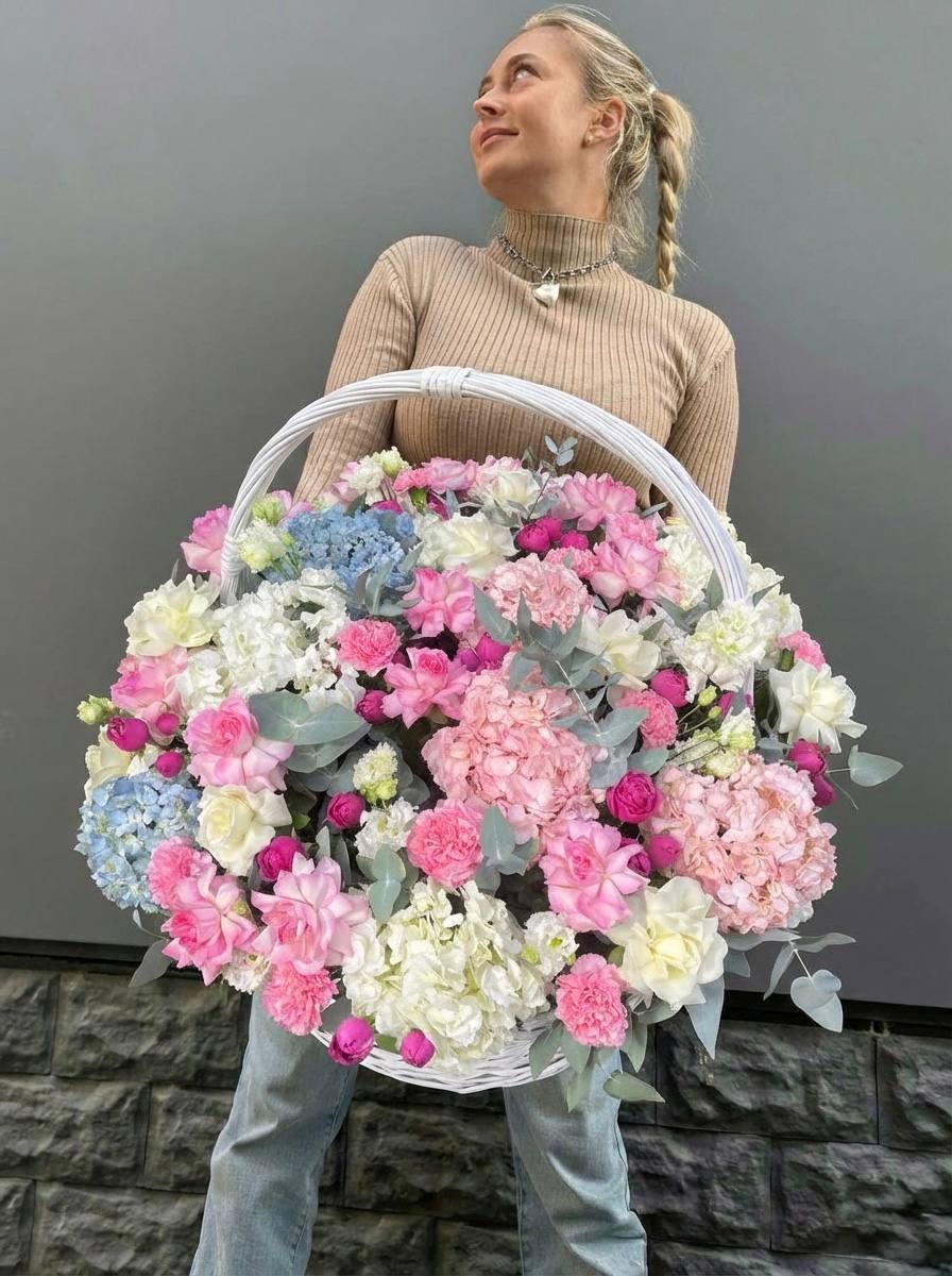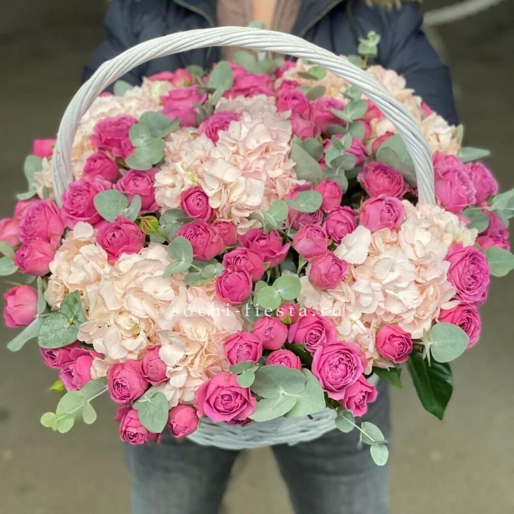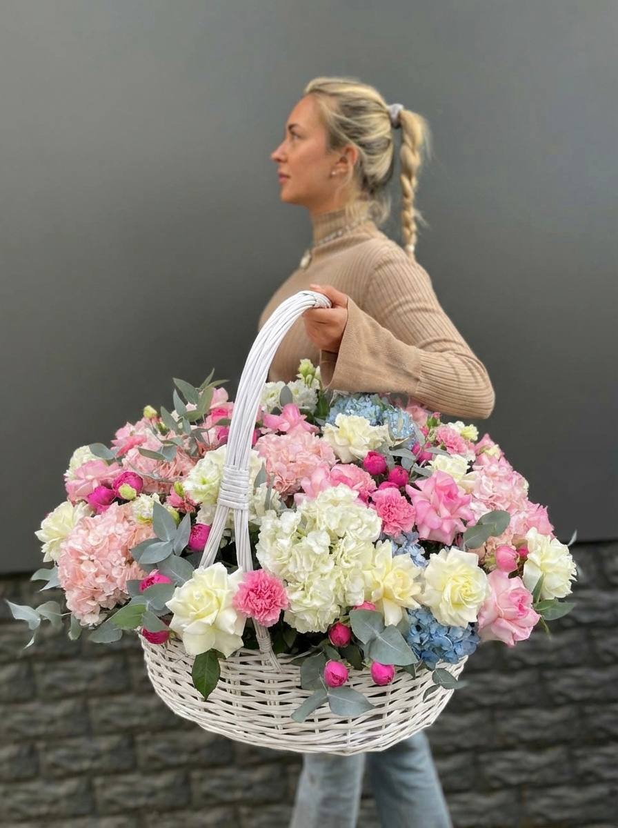 Плотная сферическая форма из пышных бутонов создаёт объёмную композицию в плетёной корзине. Ветки эвкалипта добавляют воздушности между головками цветов. Классическое решение для яркого события или знакового дня в жизни близкого человека.