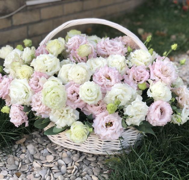 Белые розы и эустома образуют воздушную композицию с мягкими переходами между соцветиями. Хризантемы и маттиола добавляют объема, а гипсофила создает легкую дымку по краям. Корзина выглядит свежо и собранно в любом пространстве.