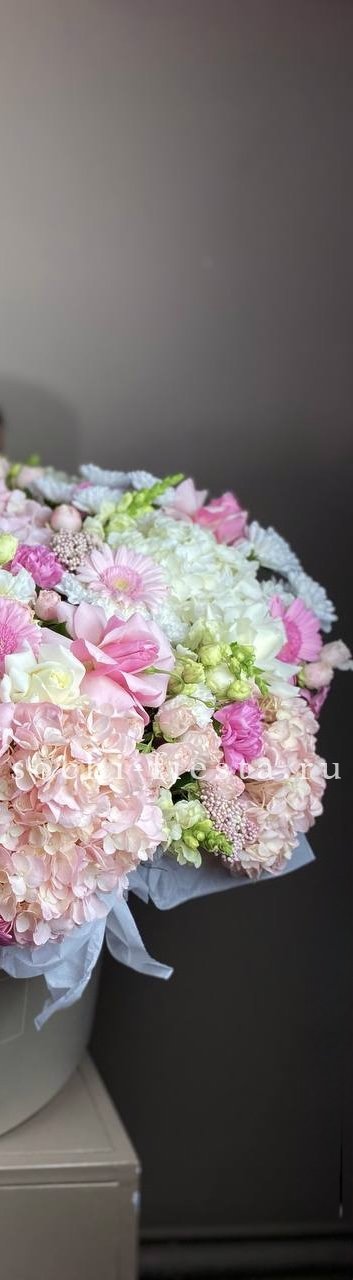 коробка с цветами разноцветного градиента (гортензии, розы, герберы, диантусы, кустовые розы, альстромерии, хризантемы, антирринум, озотамус).
