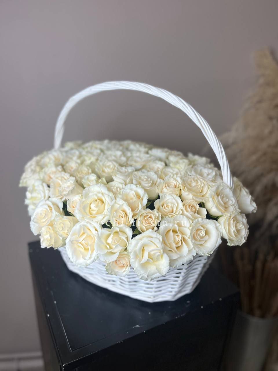 41 пионовидная кустовая роза Misty Bubbles, эвкалипт, светлая корзина.