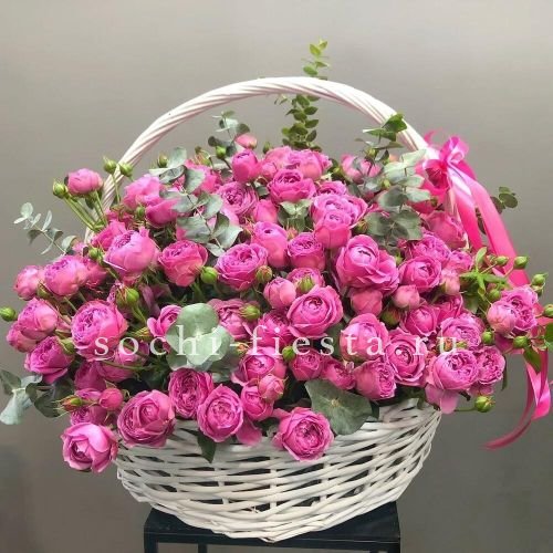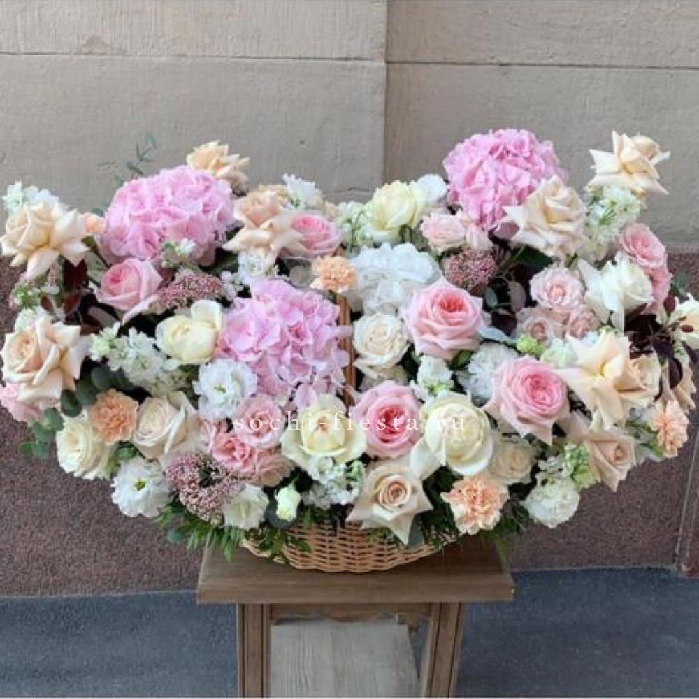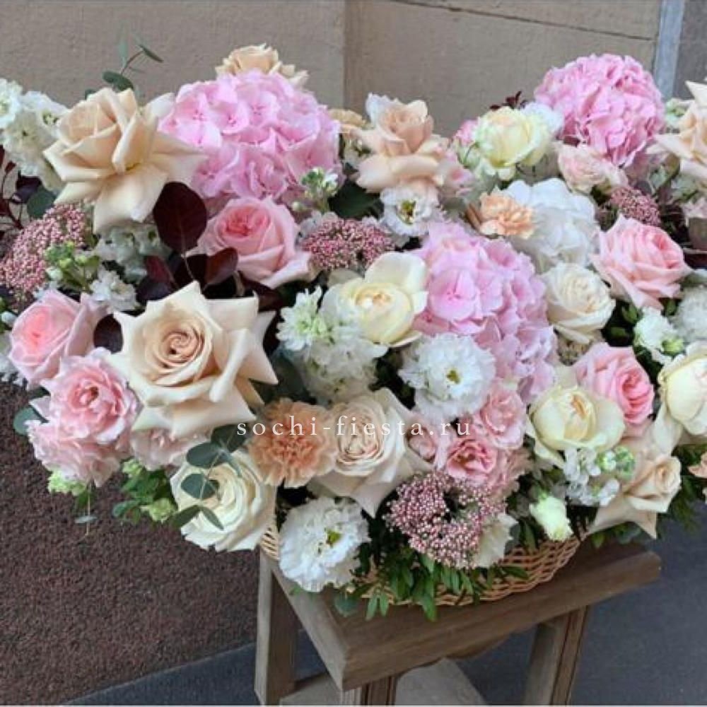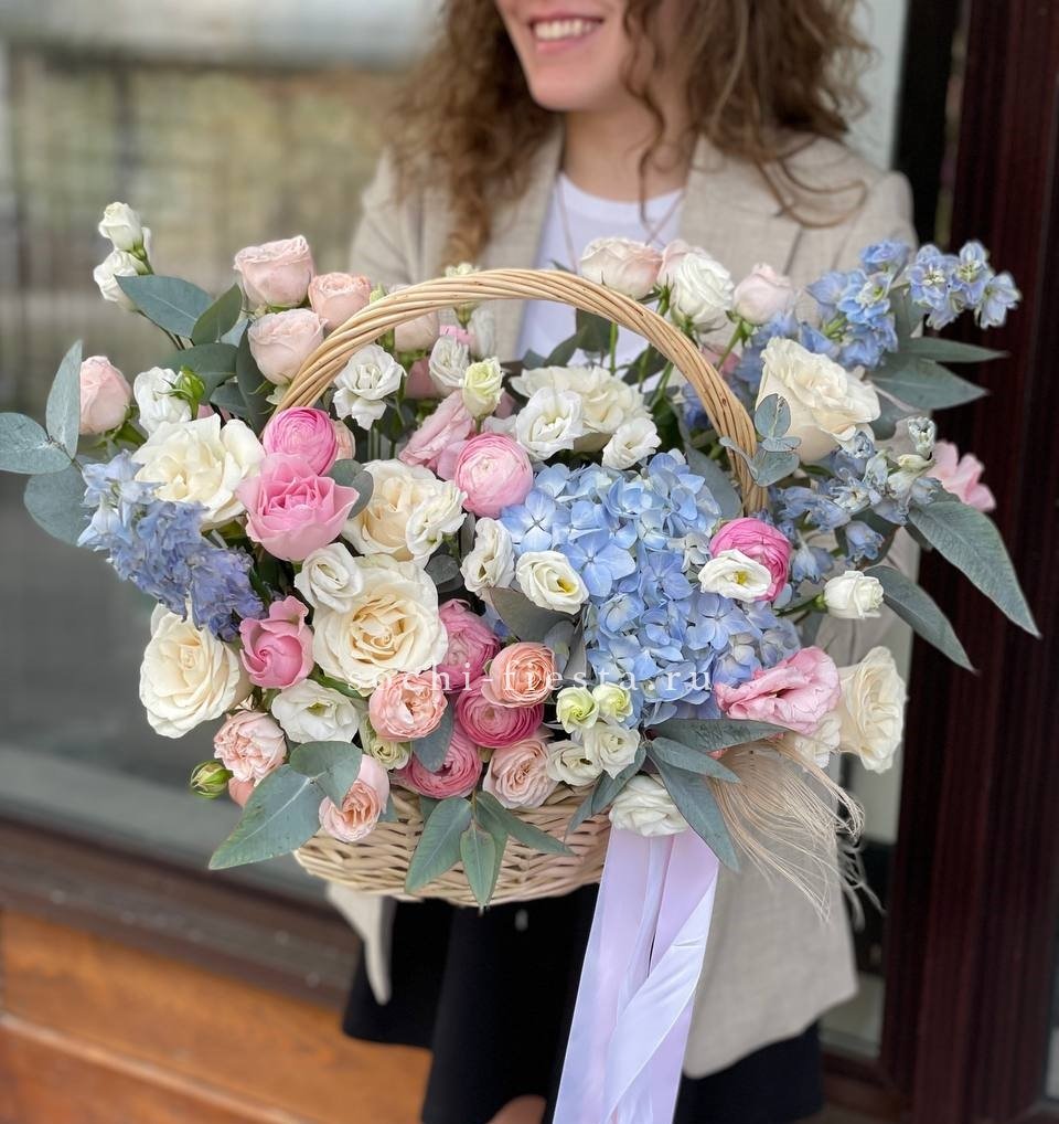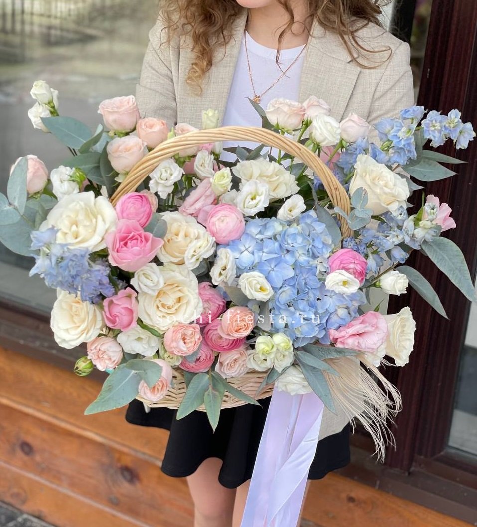 диантус, роза кустовая, гипсофила, гортензия, дельфиниум/львиный зев/маттиола (замена вне сезона), белая роза, георгины или аналог, эвкалипт, оазис, корзина D 25, двойной бант Состав композиции может быть незначительно изменен флористом в процессе изготовления с соблюдением стилистики, фактуры и цветовой гаммы оригинала.