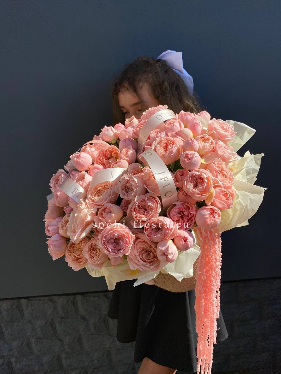 кустовые пионовидные розы сорта "Джульетта", джутовое кашпо, тишью, лента.