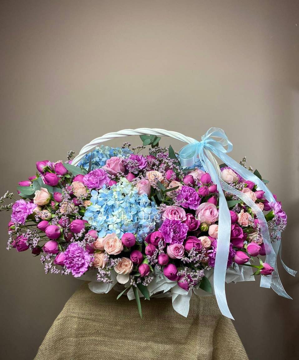 Сине-фиолетовая гамма с переходом в лавандовые и пыльно-розовые оттенки создает глубокую многослойную палитру. Пионовидные формы и воздушная гортензия дают объемную текстуру, а эвкалипт добавляет графичности.