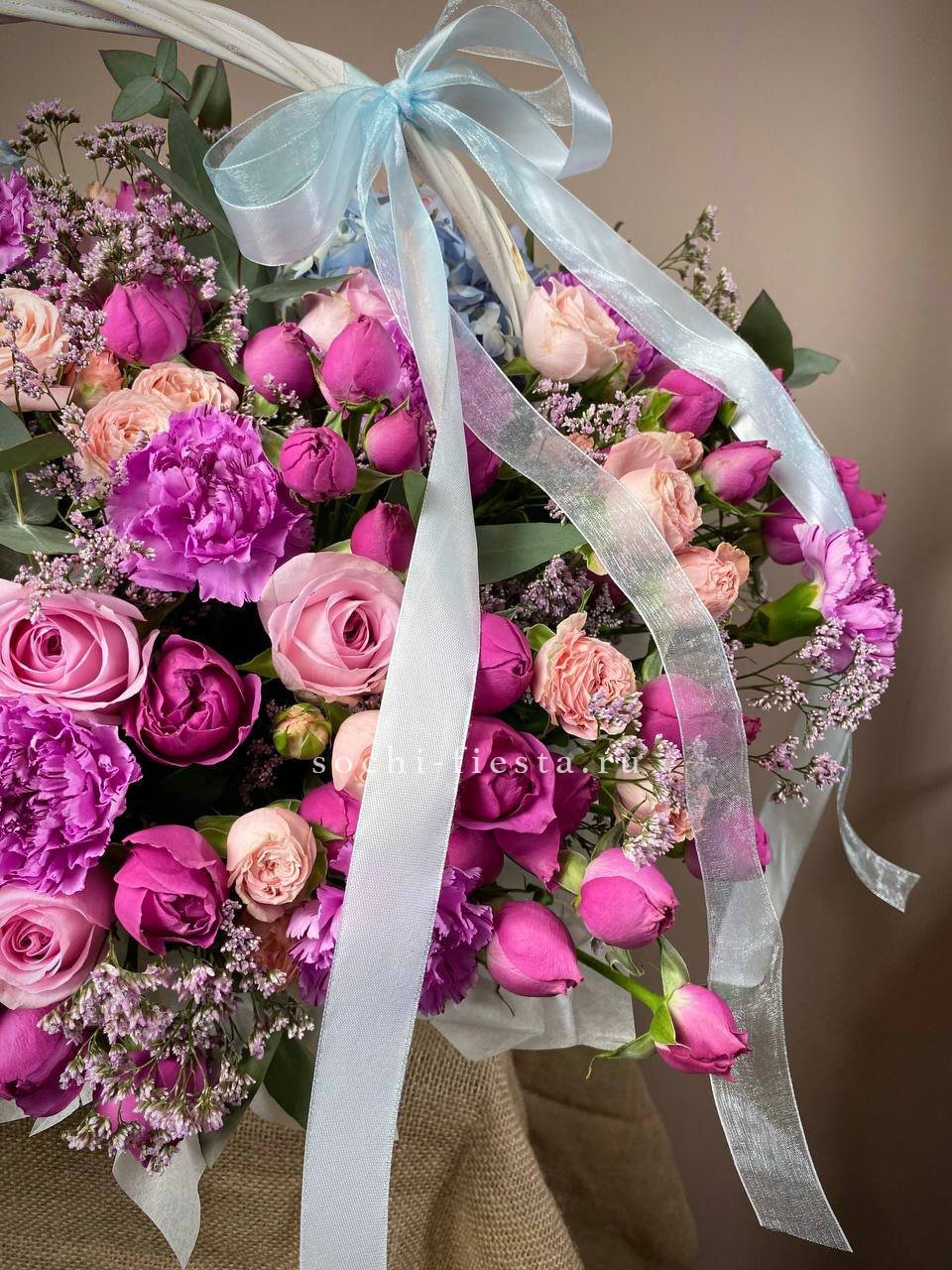 розы, диантусы, пионовидные кустовые розы, гортензия, эвкалипт, вспомогательная зелень, лента, дизайнерская упаковка.
