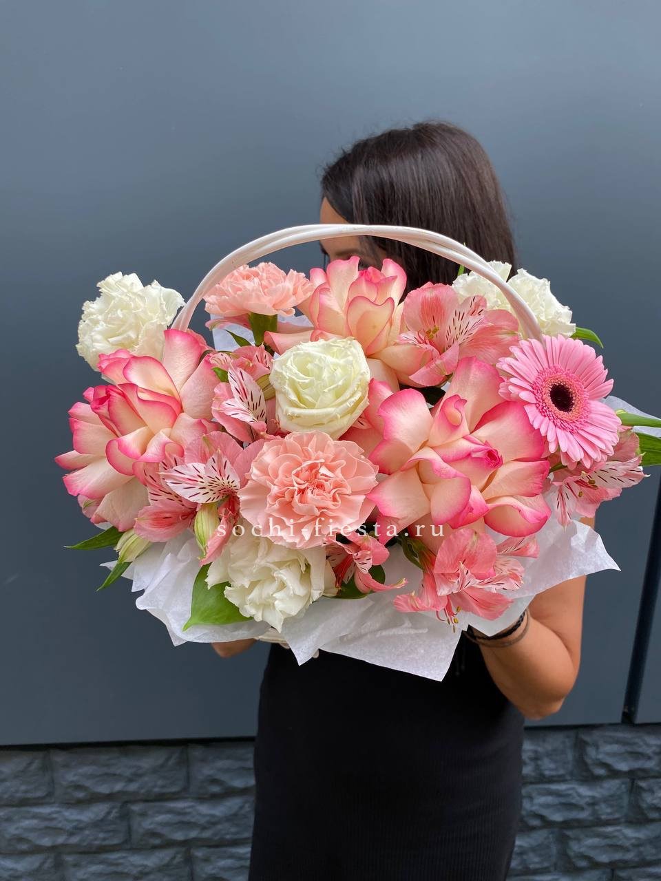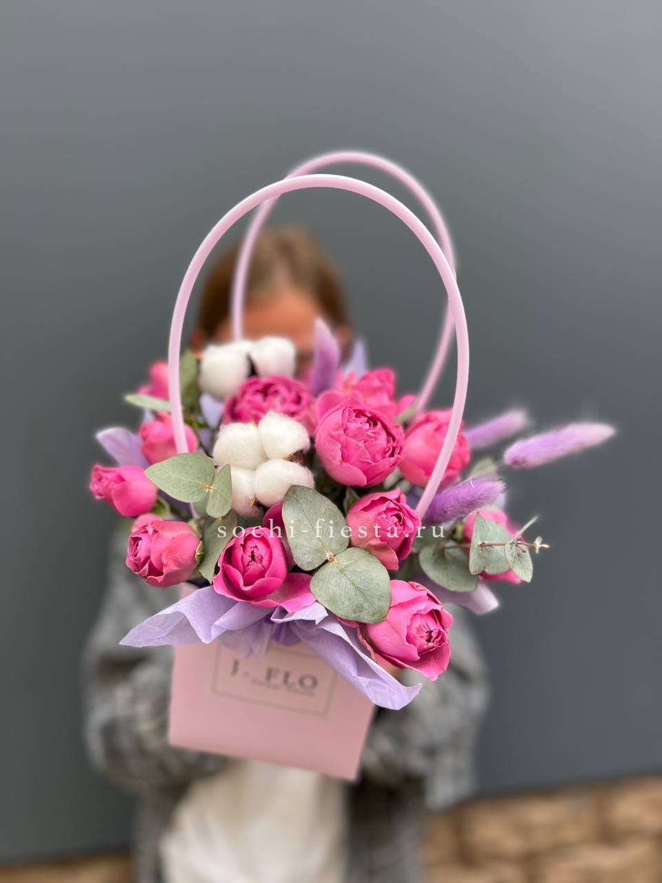 Пятьдесят один бутон Мисти Баблс собраны в плетёную корзину и образуют плотную цветущую полусферу. Лавандовые оттенки раскрываются постепенно и держат форму долго.