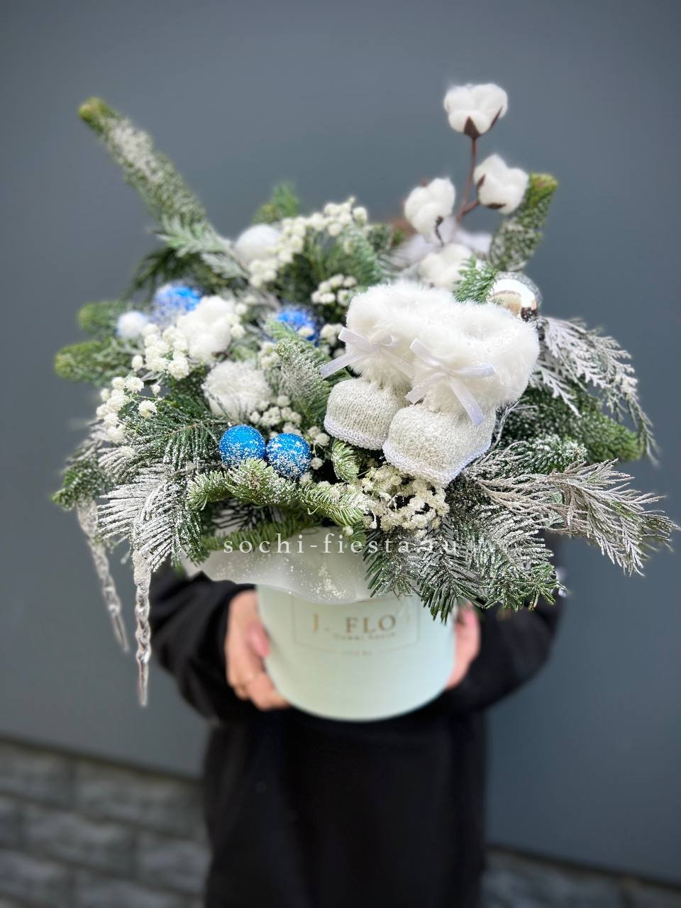 Датский нобилис сочетается с воздушной гипсофилой и красными игрушками в праздничном боксе. Хлопок и декоративные сапожки создают тёплую зимнюю картину прямо на столе.
