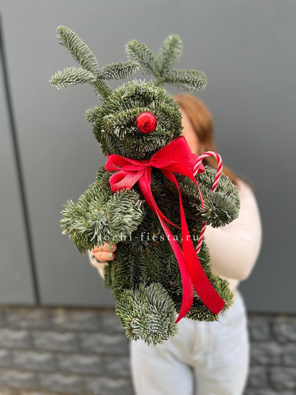 Фигура оленя полностью собрана из веток нобилиса. Объёмная скульптура с выразительным силуэтом заполняет пространство. Живая хвоя создаёт насыщенный зелёный фон для интерьера.