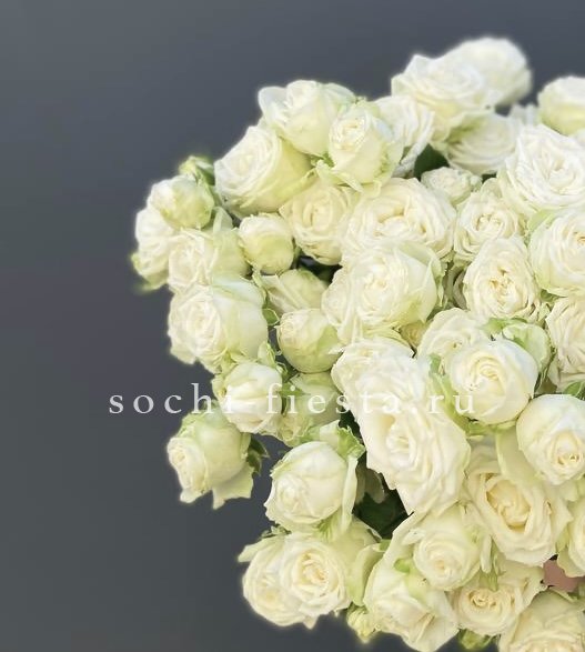 Белоснежные розы Бомбастик с густыми многолепестковыми бутонами собраны в свободную охапку. Каждый цветок раскрывается постепенно, создавая объёмную фактурную композицию.