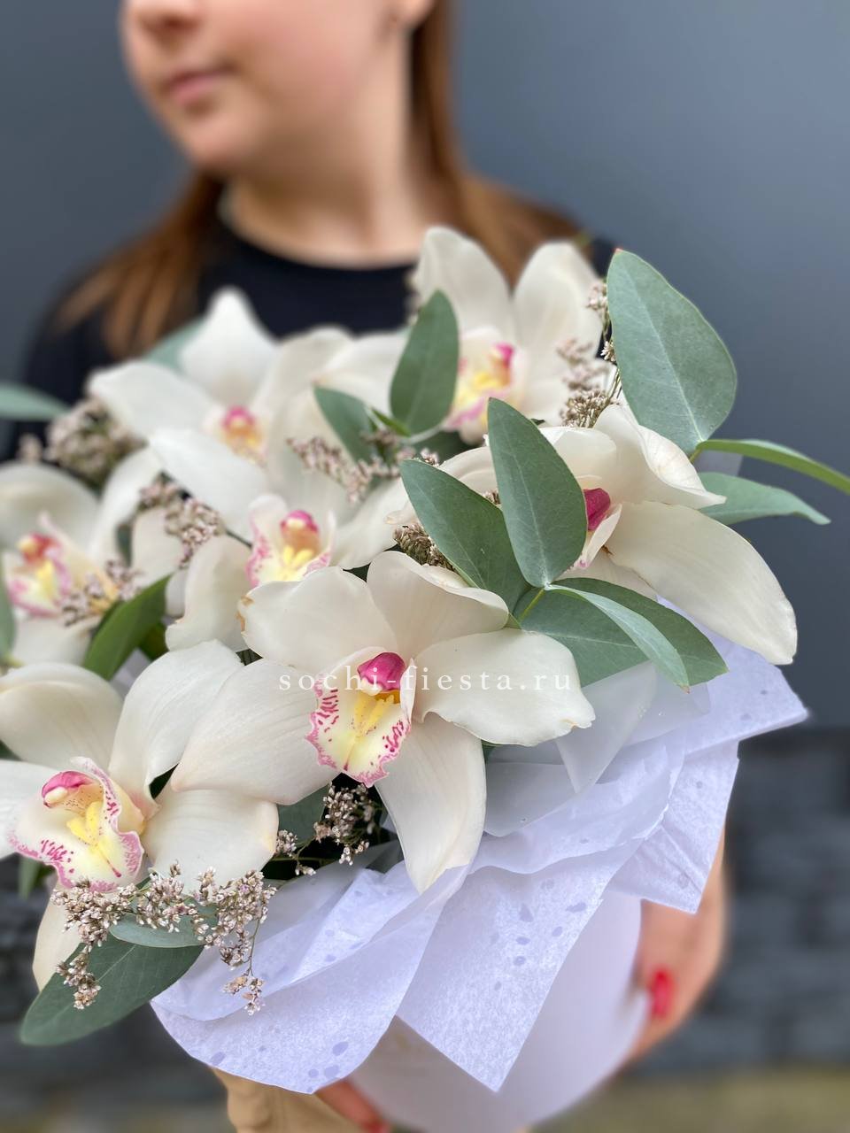орхидеи, розовые розы, эвкалипт, гипсофила, джут кашпо.