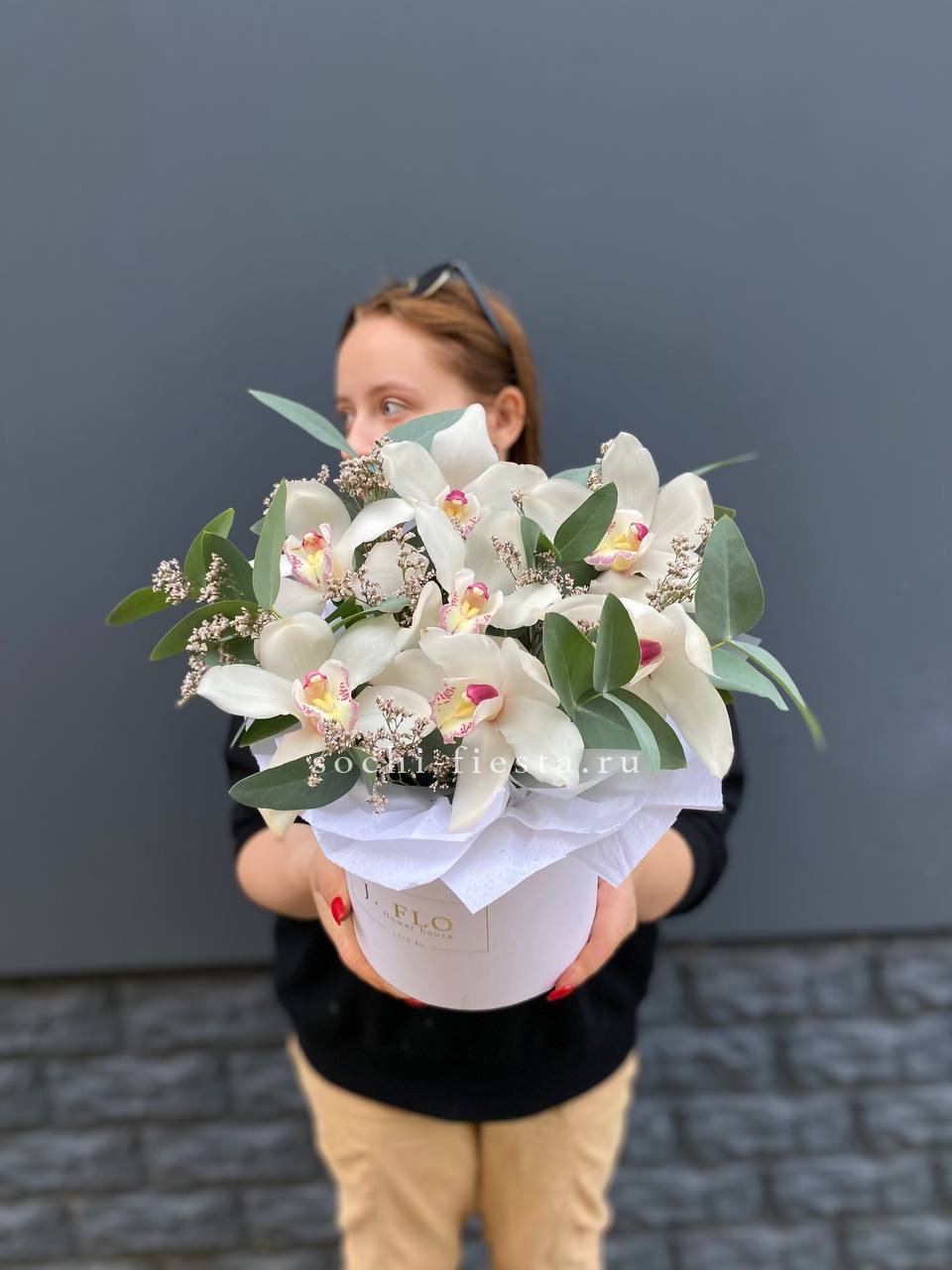 Белоснежные орхидеи и розовые розы собраны в природном джутовом кашпо. Воздушная гипсофила добавляет композиции легкости, а эвкалипт привносит свежие нотки.