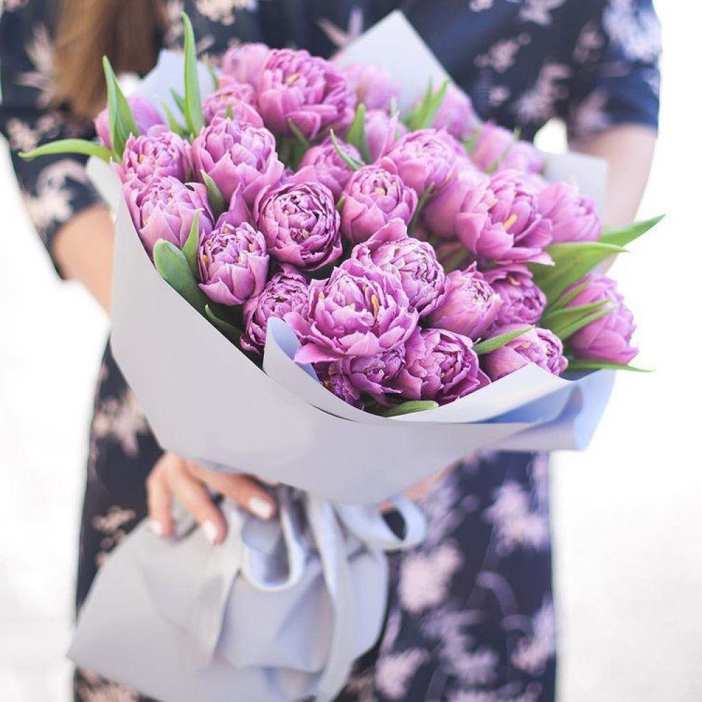 пионовидные тюльпаны 35шт., лента, дизайнерская бумага.