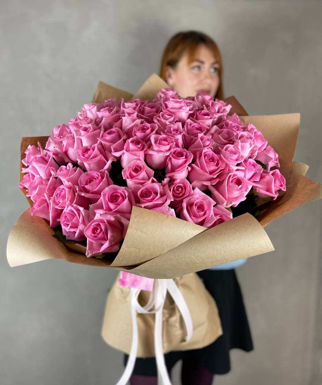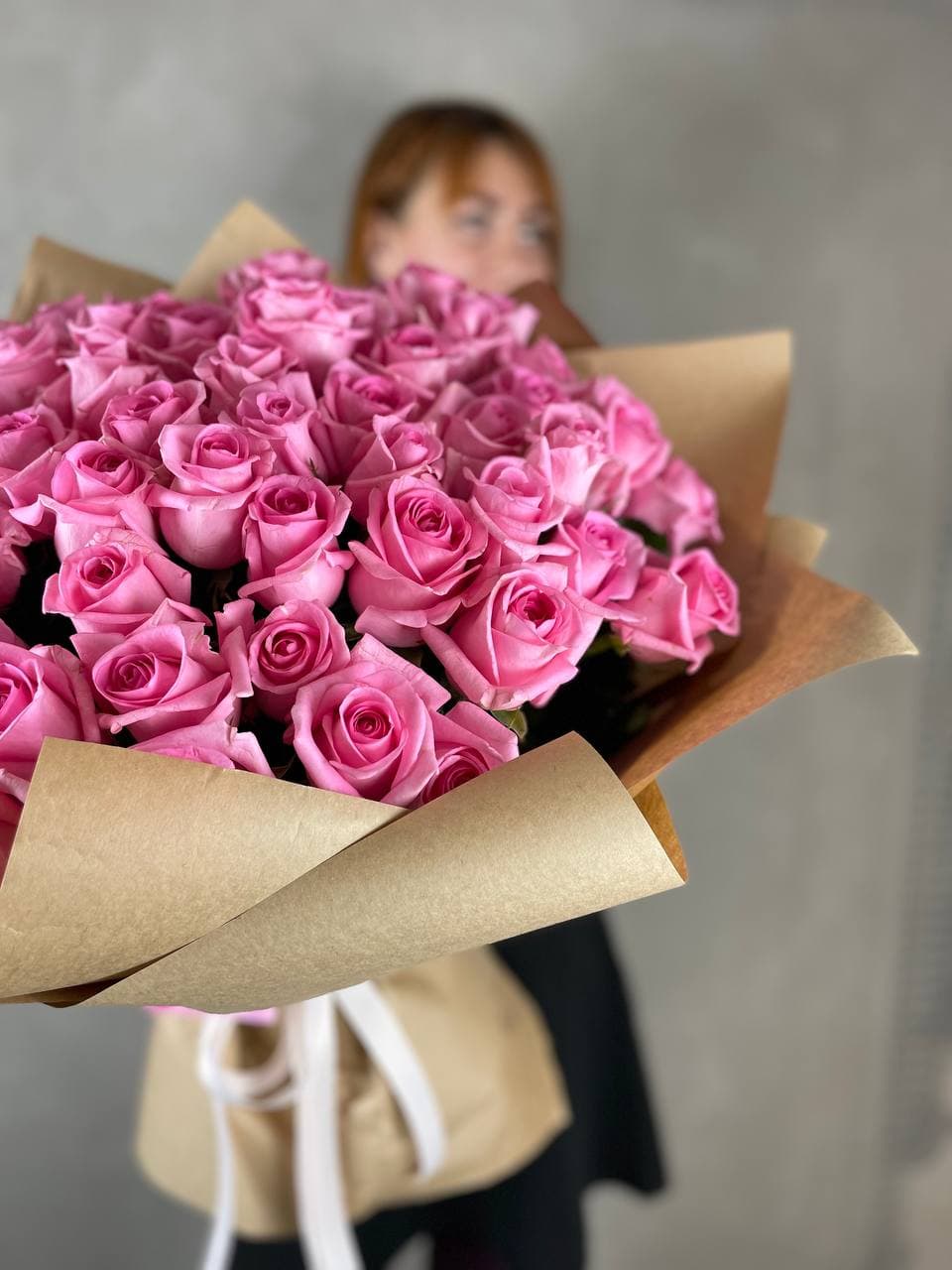 Состав букета на фотографии: 29 роз карина, крафт, лента