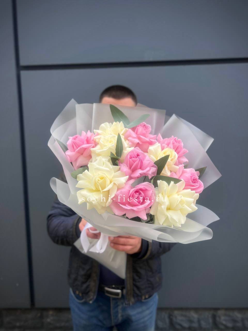 Переход от белого к розовому создаёт мягкую игру тонов. Эвкалипт добавляет фактурности и свежести зелени. Одиннадцать роз складываются в гармоничную композицию с лёгким характером.