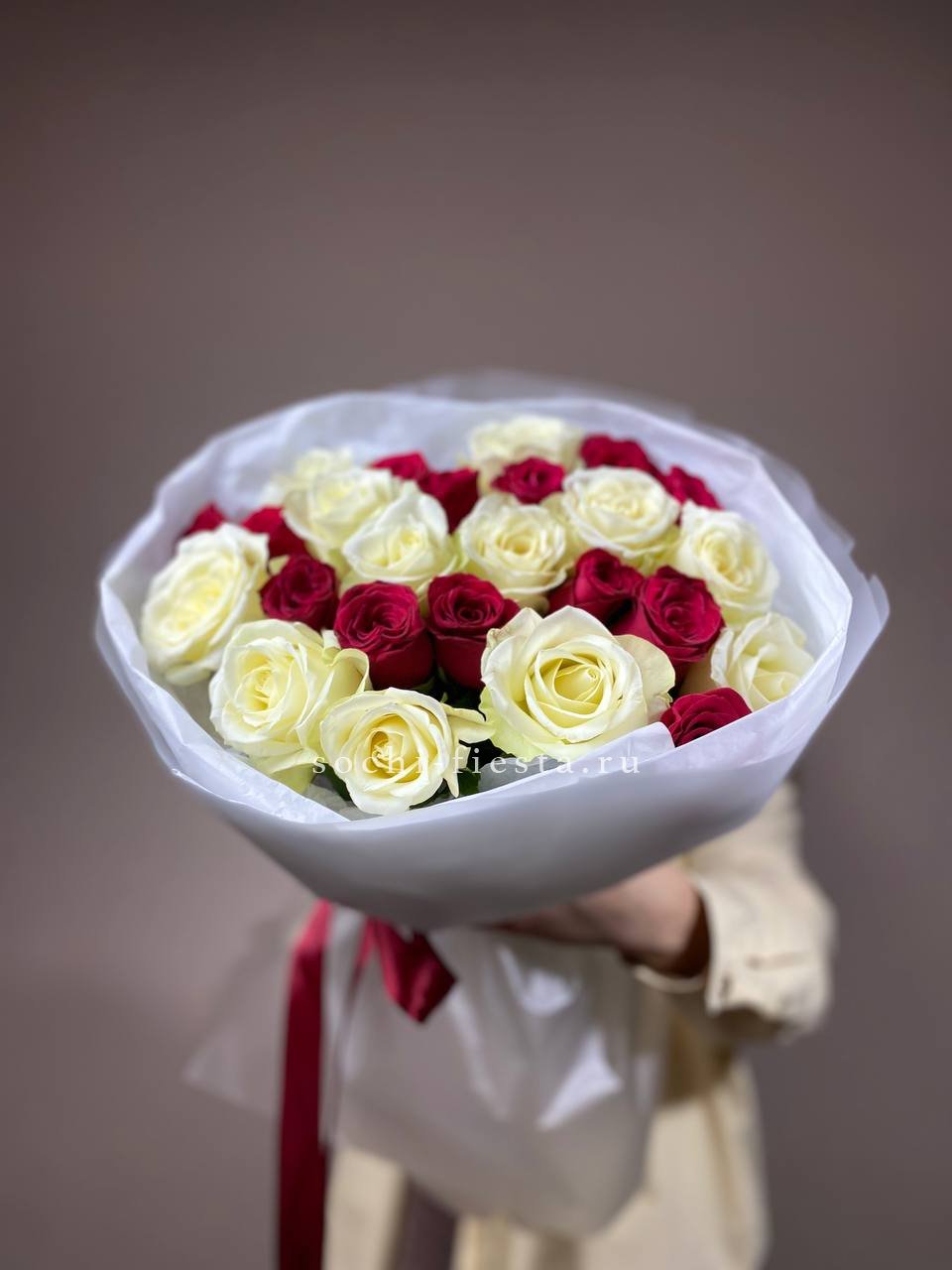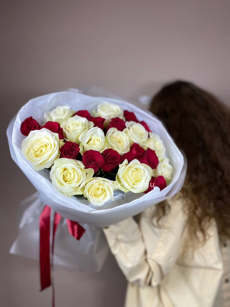 Белые и красные розы переплетаются в динамичной игре света и тени. Двадцать семь бутонов создают живописный рисунок, где каждый цвет усиливает звучание другого без лишних слов.