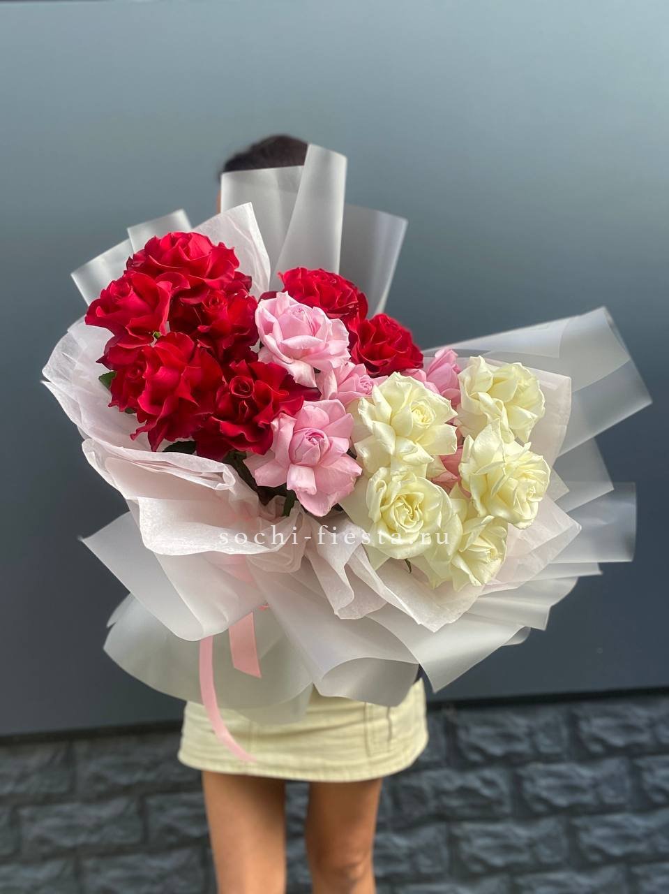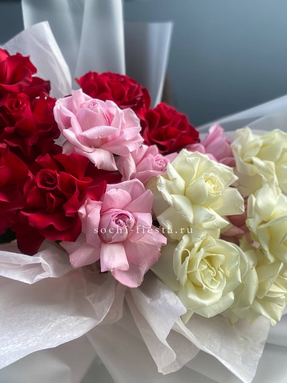 Красные и белые розы чередуются в крупной композиции, создавая живую игру света и тени между бутонами. Контрастная палитра подчеркивает свежесть каждого цветка и придает динамику всему букету.