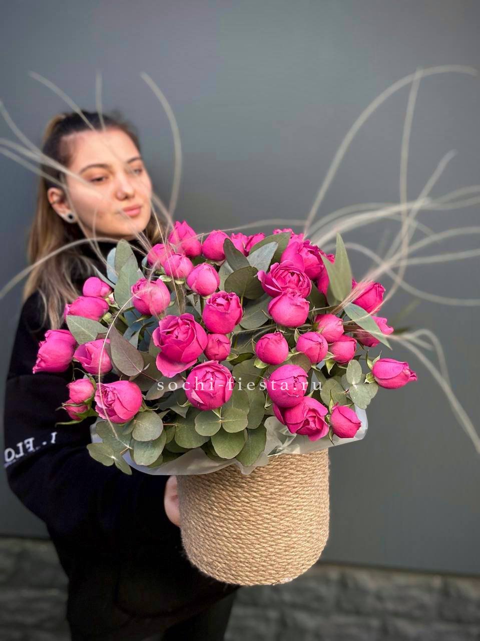 Семь пышных кустовых роз собраны в плотный круг и обрамлены воздушными ветками хамелациума. Бутоны раскрыты почти полностью, создавая объёмную шапку с мягкими переходами оттенков. Композиция держит форму и выглядит самодостаточно.