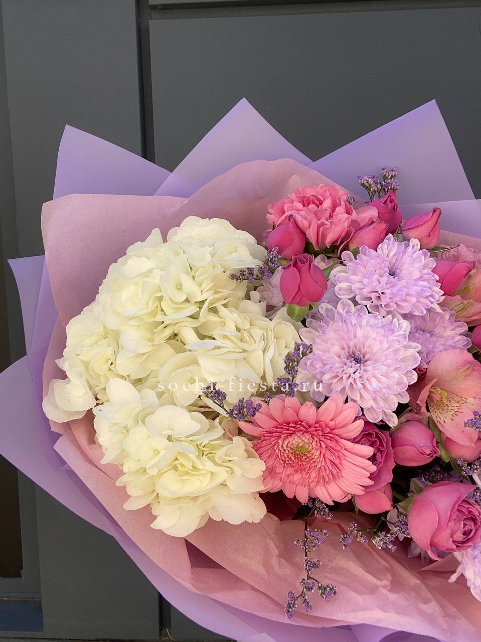 гортензия, кустовые хризантемы, кустовые розы мисти бабблс, герберы, диантусы и лимониум, оформление.