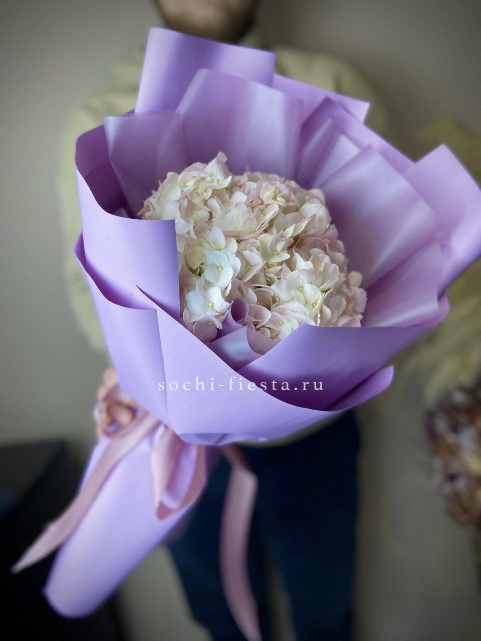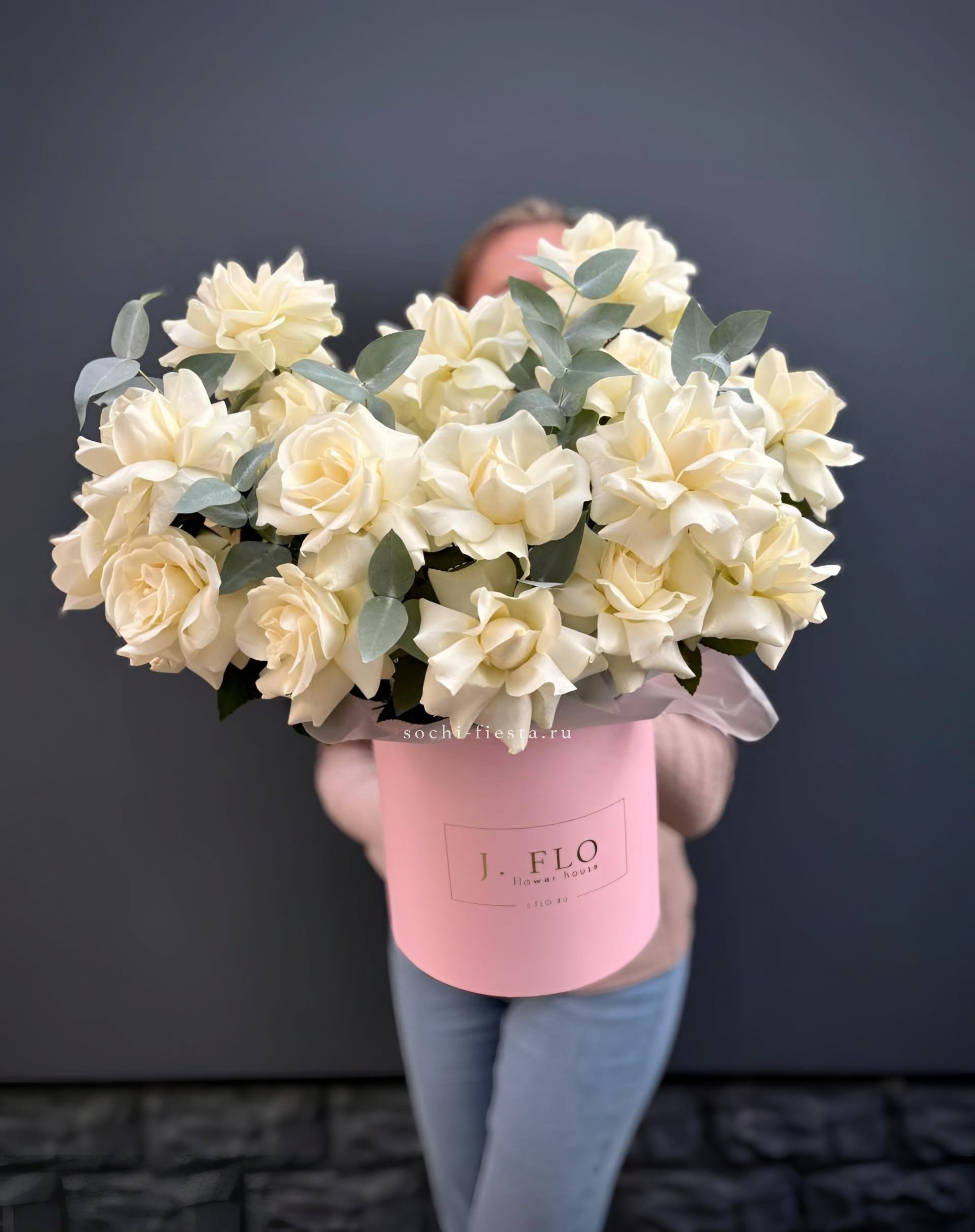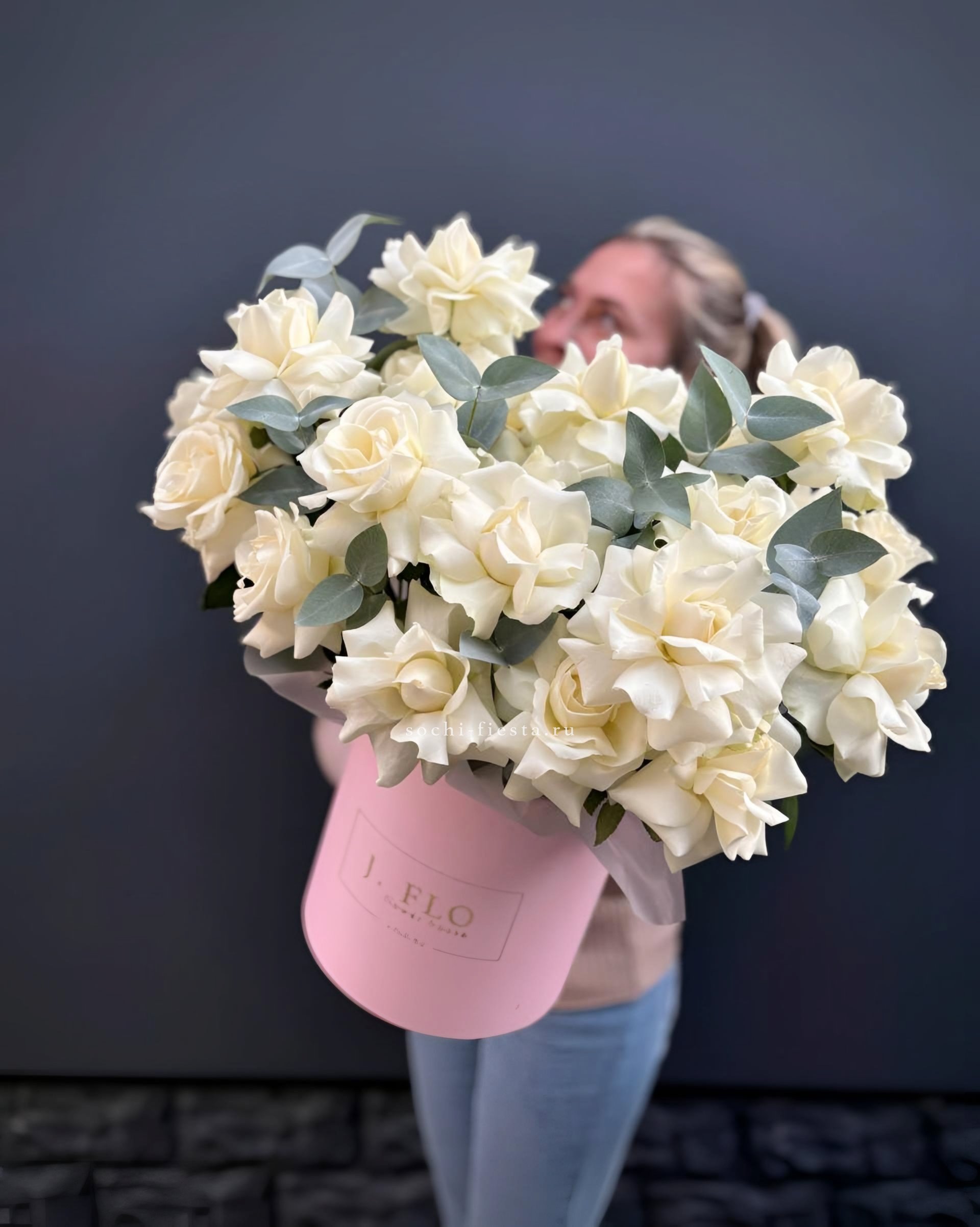 Белые розы и шары гортензии заполняют пространство плотно, но без тяжести. Озатамус вносит лёгкую текстуру, а эвкалипт завершает силуэт спокойной зеленью.