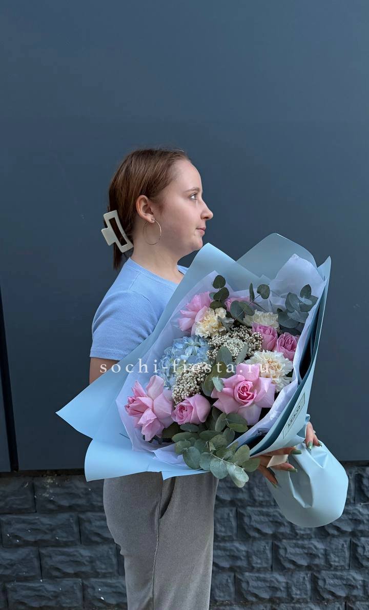 Розовые розы, пионовидная кустовая роза, эвкалипт,  лента, авторская упаковка.