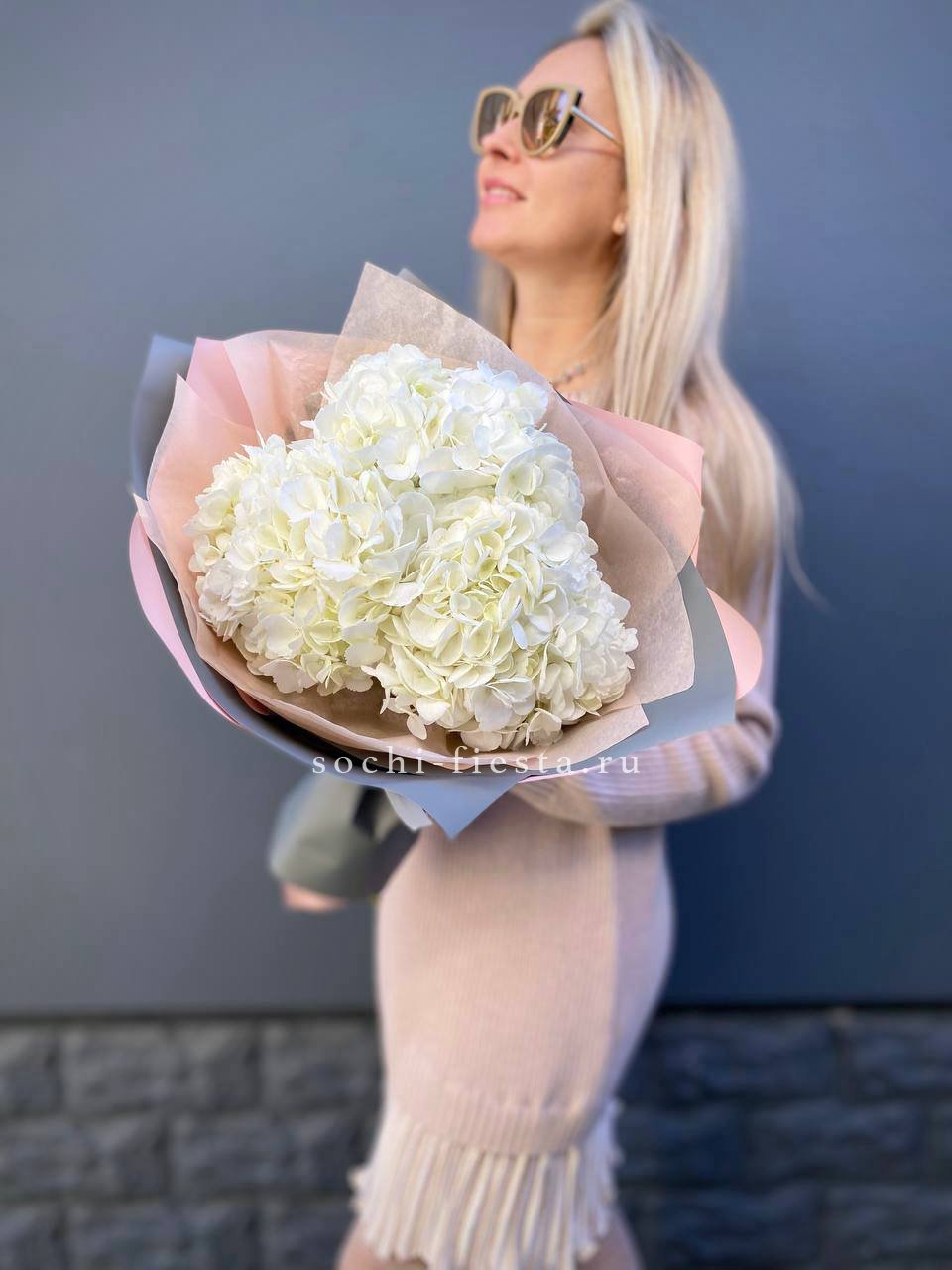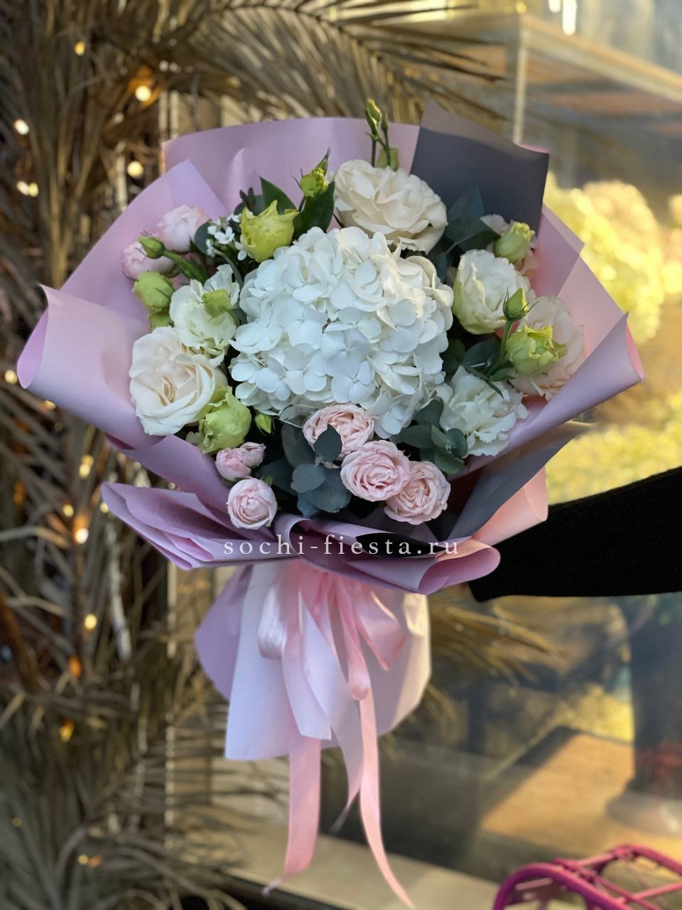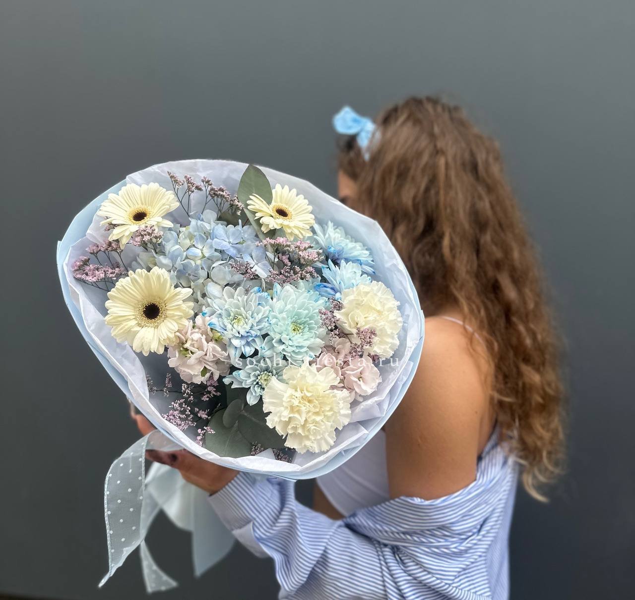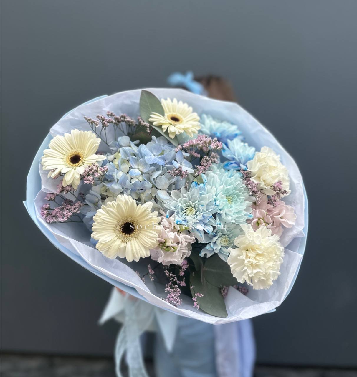 Пастельные оттенки гортензий переплетаются с белоснежными хризантемами, создавая воздушную дымку. Мягкие переходы тонов напоминают утренний туман над садом.