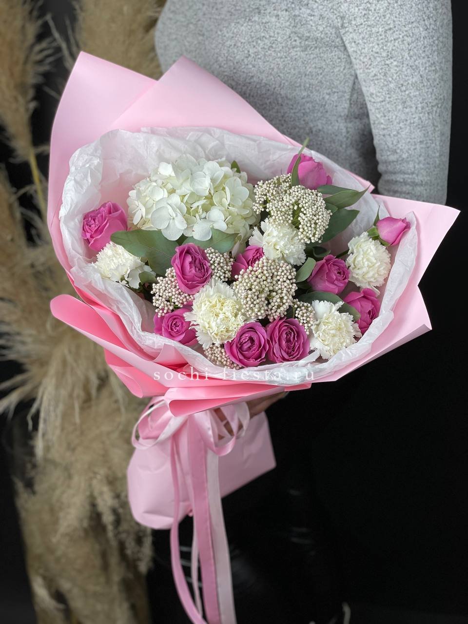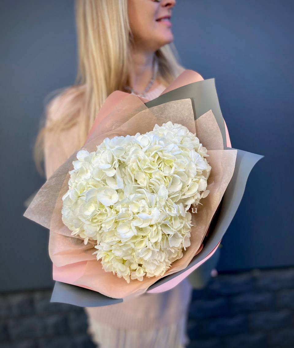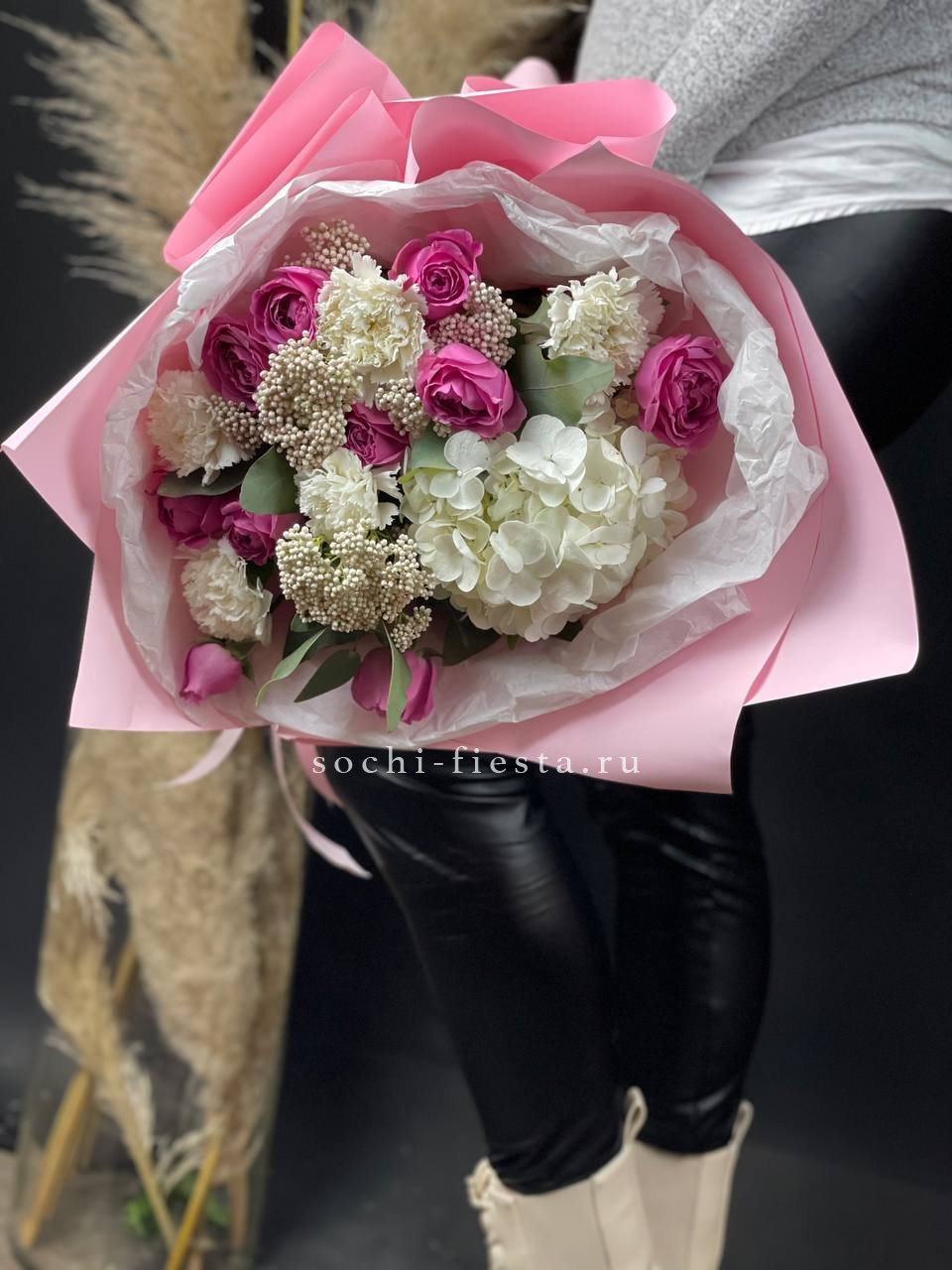 гортензии, хризантемы, лента и дизайнерская пленка.