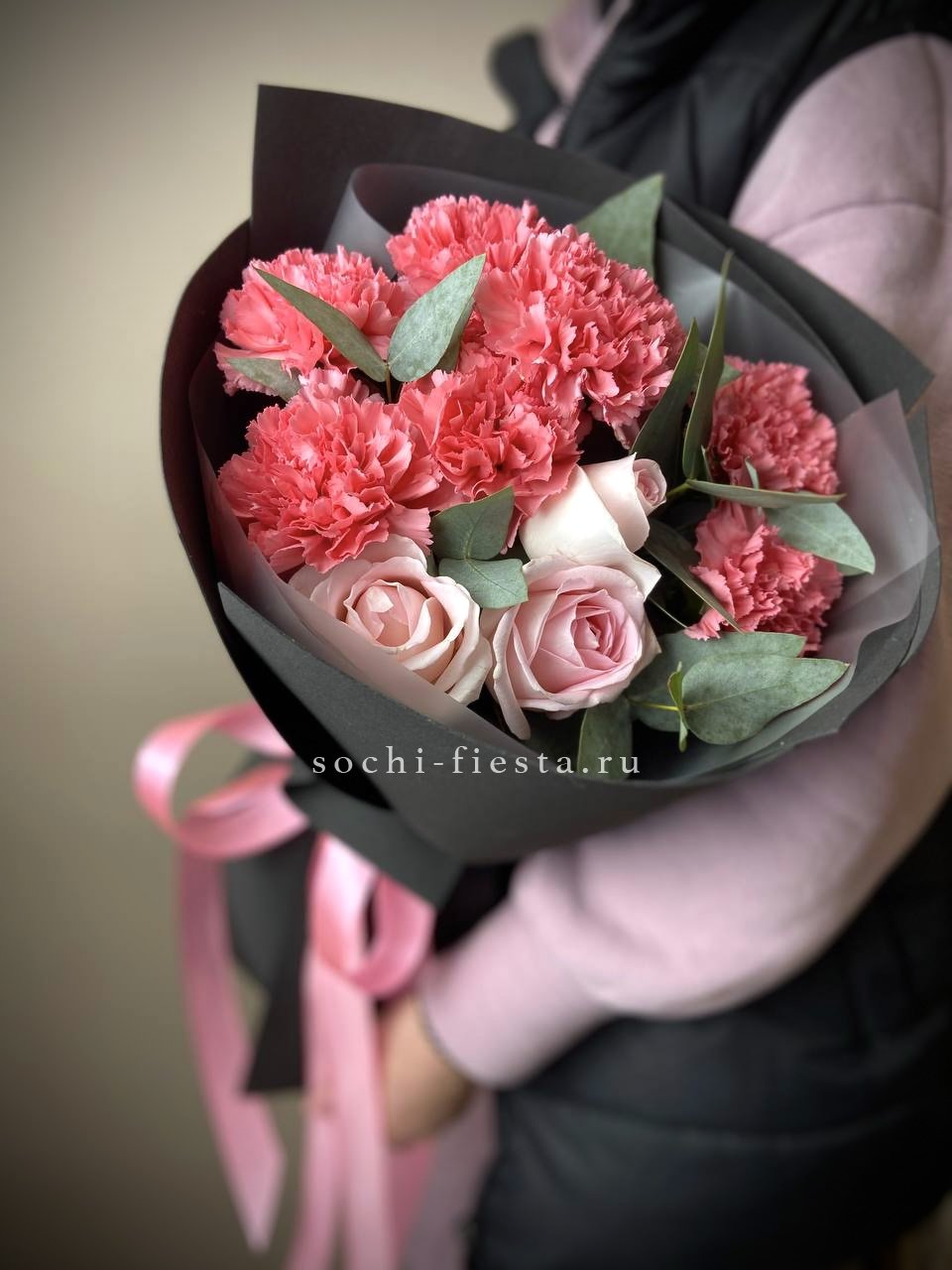Плотные головки диантусов рассыпаны между кустовыми розами, создавая живую текстуру. Компактная форма букета удобна для небольших пространств и долго сохраняет свежесть.