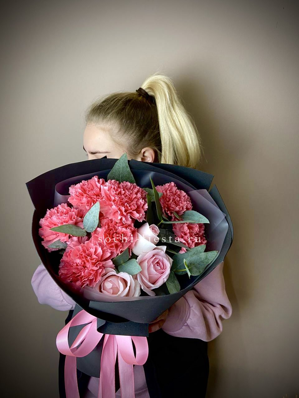 роза кустовая, диантус, лента, дизайнерская упаковка.