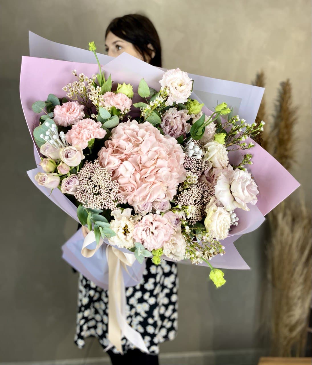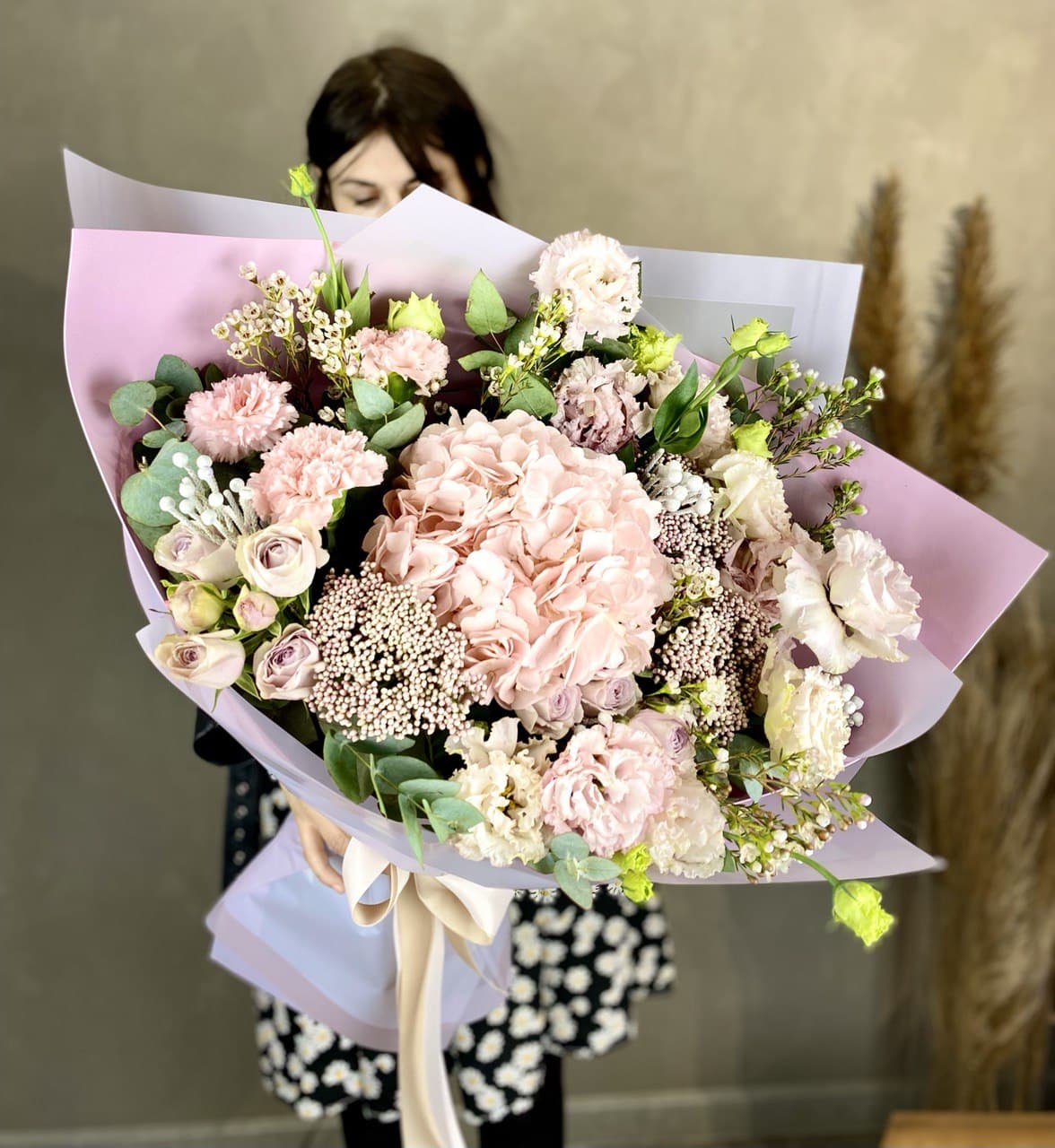 Пышная шапка гортензии уравновешивает вертикальные стрелы антиринума, а джумилия добавляет глубину бордовыми акцентами. Композиция построена на чередовании плотных соцветий и воздушных метёлок лимониума.