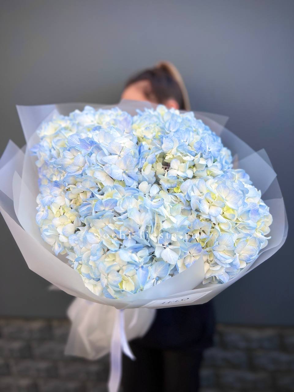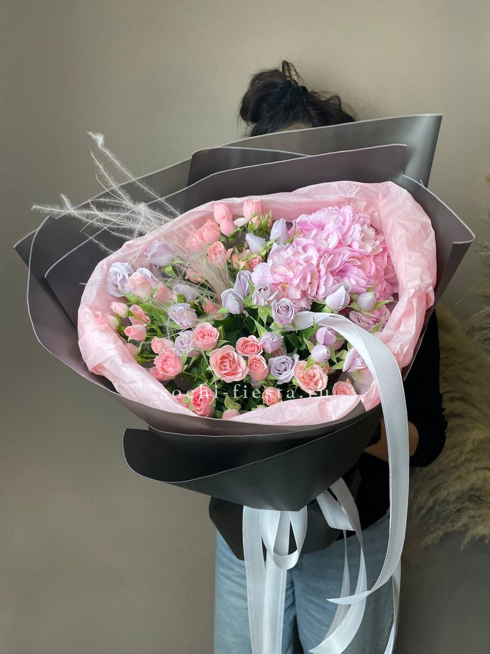 гортензия, розы, эустома, кустовая пионовидная роза, эвкалипт, лента, дизайнерская упаковка.