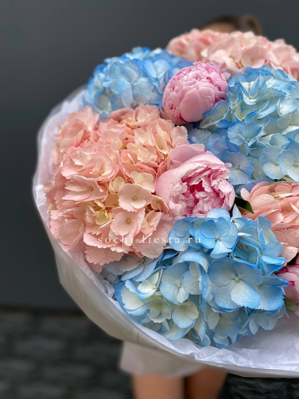 Два отдельных букета в одной композиции: пышные головки гортензий и густомахровые пионы. Каждая часть завернута в тишью и пленку, сохраняя свою форму и свежесть.