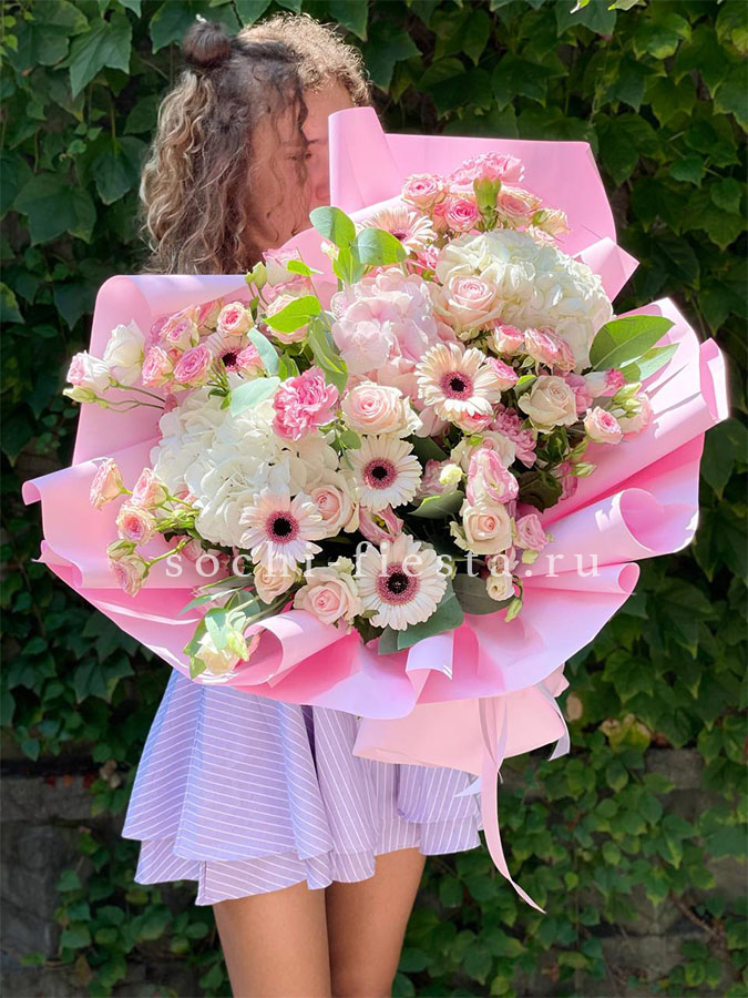 Пышная шапка из роз двух оттенков с объёмной гортензией и воздушным диантусом создаёт мягкий переход от белого к розовому. Бомбастик добавляет букету плотности, а эвкалипт освежает общую композицию. Универсальное решение для яркого поздравления.
