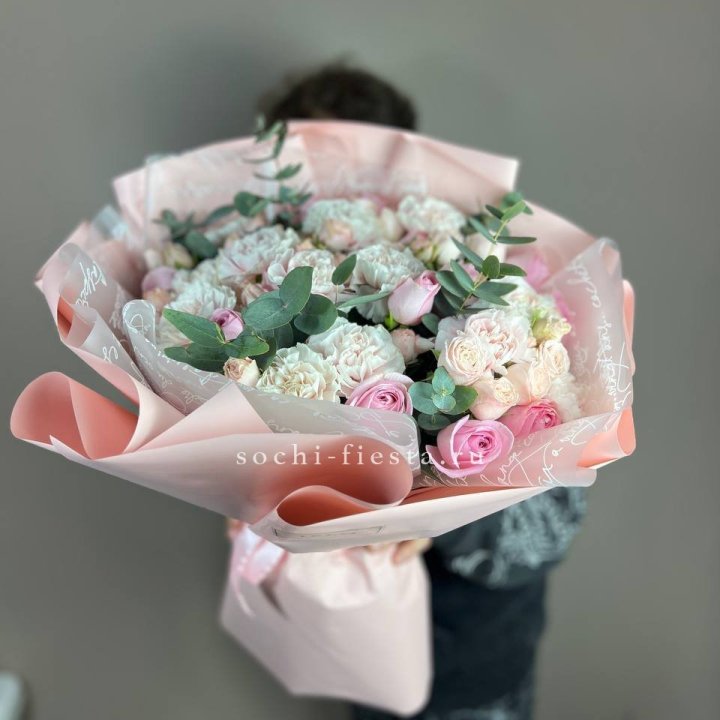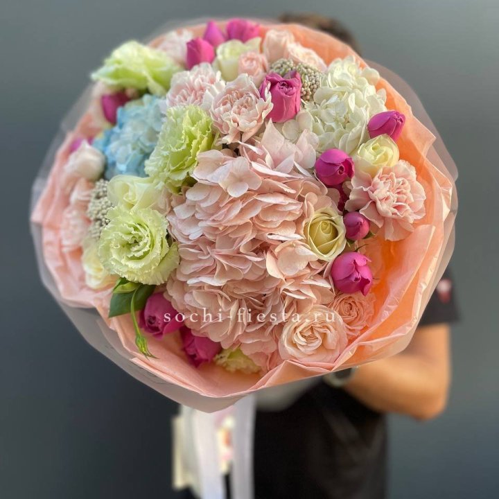 Сезонные хиты в Абакане складываются из классической голландской и эквадорской срезки круглый год плюс сезонные акценты. Пионы в мае-июне, гортензия летом, хризантемы осенью, амариллис зимой. Местные тёплые теплицы добавляют свежие позиции в межсезонье.
