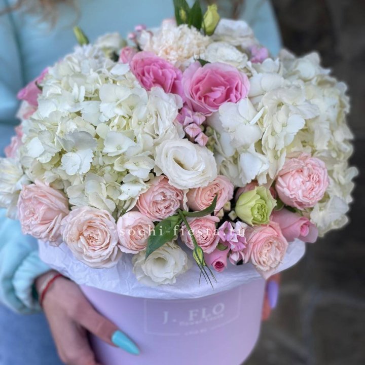 - Шляпная коробка с розами и гипсофилой — универсальный подарочный формат.